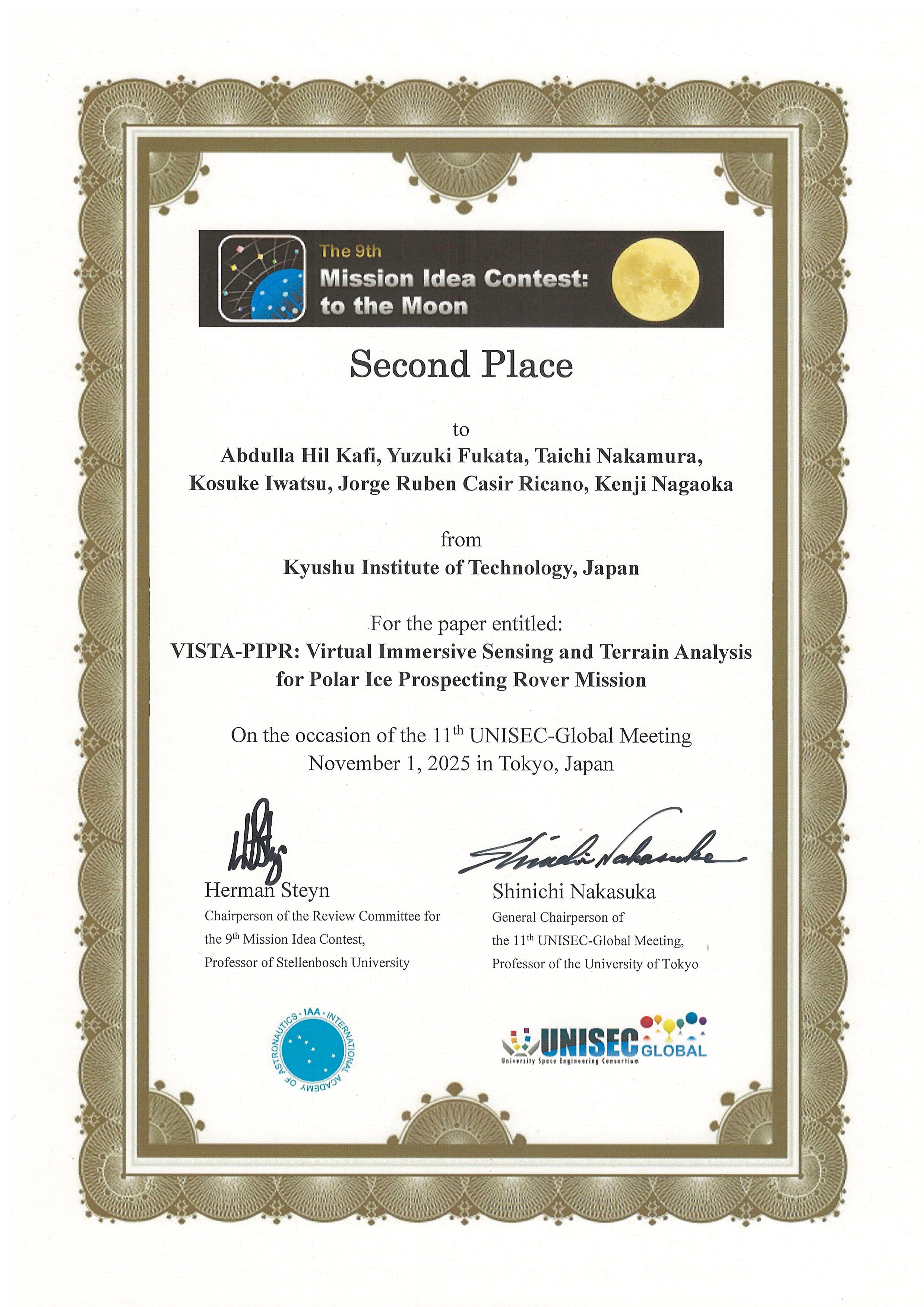 2025年11月1日,東京大学で開催されたThe 11th UNISEC-Global MeetingのThe 9th Mission Idea Contest: to the Moonにおいて,当研究室からAbdulla Hil Kafi,深田唯月,中村太一,巖津公祐,Jorge Ruben Casir Ricano,永岡健司のチームがファイナリストとして参加し,2nd Place を受賞しました.